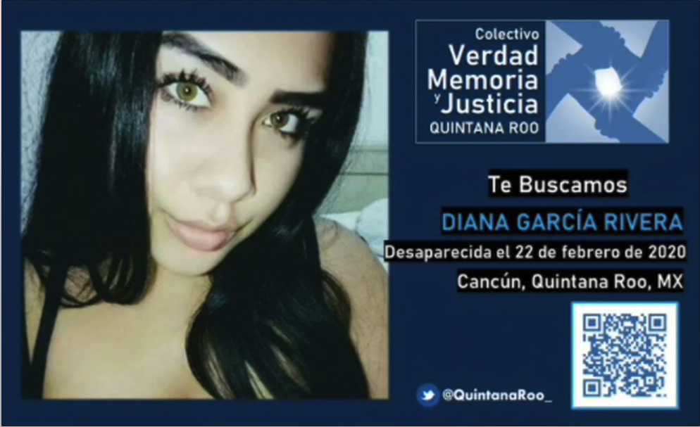 Rivera se unió a este colectivo pues ha vivido en carne propia la desaparición de su hija, Diana, de quien no sabe nada desde la madrugada del 22 de febrero de 2020, cuando un grupo armado irrumpió en un bar en el centro de Cancún y se llevó a dos personas, entre ellas a su hija.