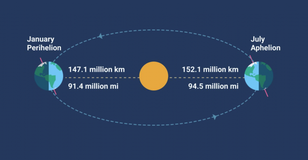 La órbita de la Tierra alrededor del Sol no es circular, por lo a veces va más lento y otras más despacio, y una vez al año, el 3 de enero en el caso de 2023, está en el perihelio o distancia mínima, de 147 millones de kilómetros, mientras que el viernes la distancia entre planeta y sol será de 152 millones de kilómetros.