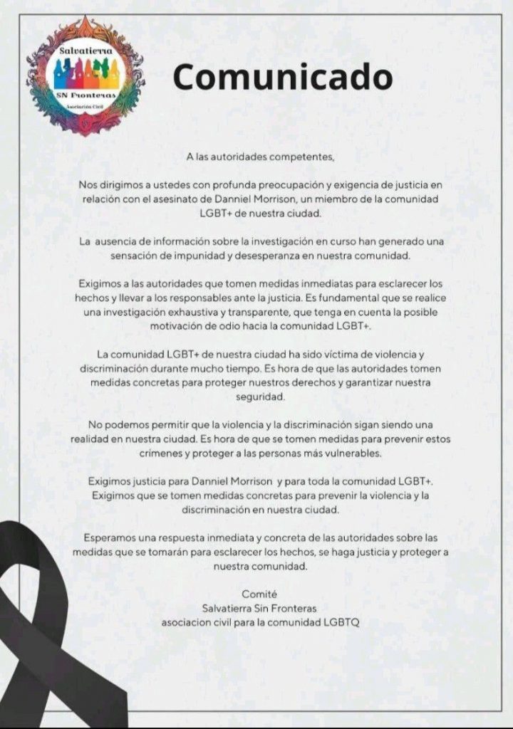 “Exigimos justicia para Daniel Morrison y para toda la comunidad LGBT+. Exigimos que se tomen medidas concretas para prevenir la violencia y la discriminación en nuestra ciudad”.