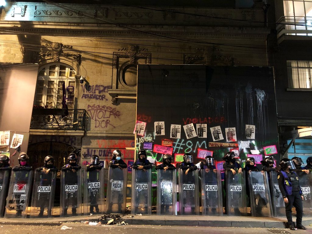 Luego de que el grupo de manifestantes derribó los tablones, alrededor de 50 elementos de la Policía de la Ciudad de México llegaron a resguardar el inmueble, que también protegieron las casas colindantes.