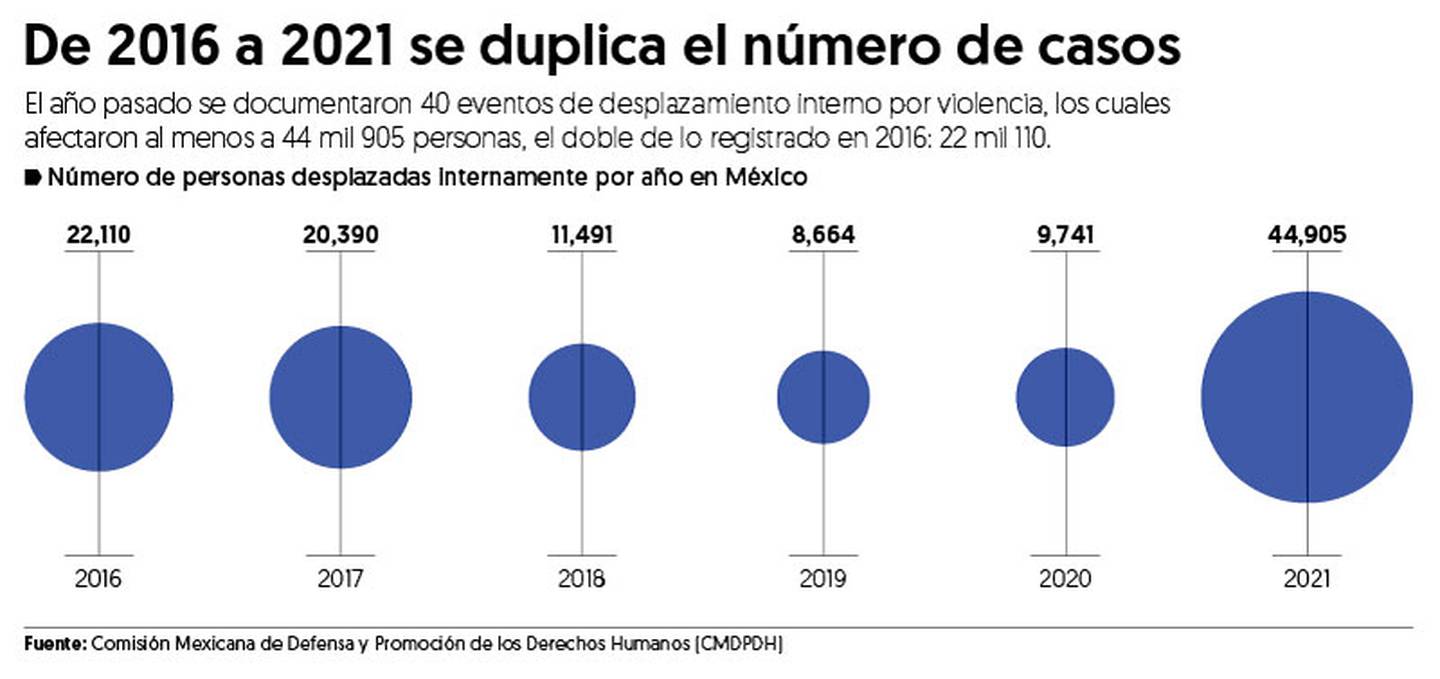 Sólo en 2021, la Comisión Mexicana de Defensa y Promoción de los Derechos Humanos (CMDPDH) documentó 40 eventos de desplazamiento interno masivo causado por violencia, los cuales afectaron por lo menos a 44 mil 905 personas en 10 entidades federativas.