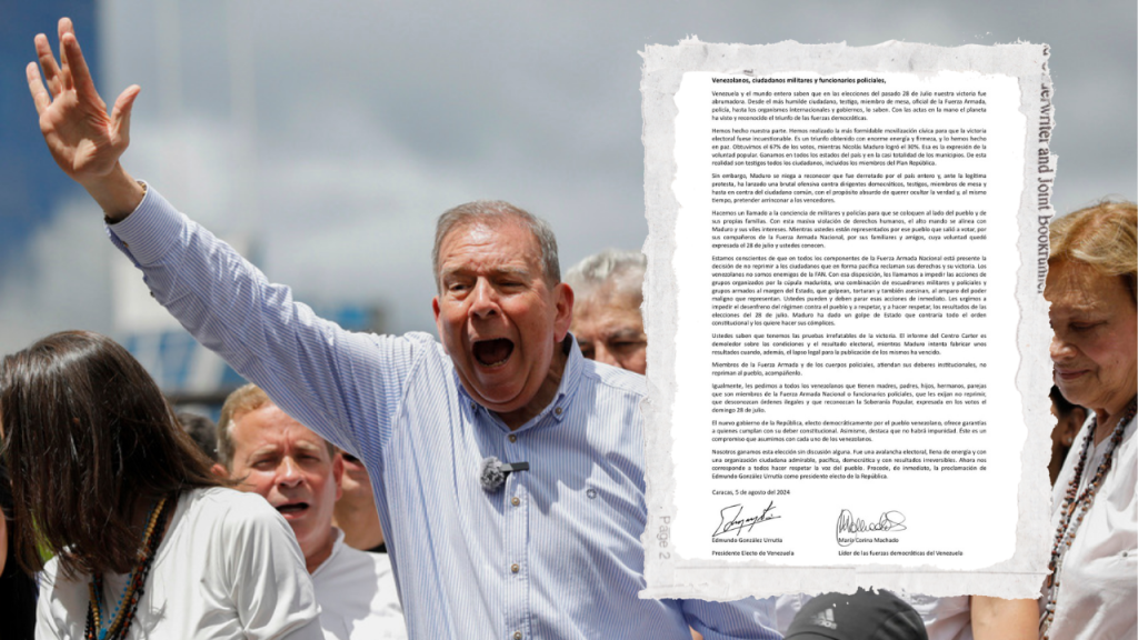 “Nosotros ganamos esta elección sin discusión alguna. Fue una avalancha electoral llena de energía y con una organización ciudadana admirable. Procede, de inmediato, la proclamación de Edmundo González Urrutia como presidente electo de la República”, se lee a través de una carta escrita por el candidato opositor.