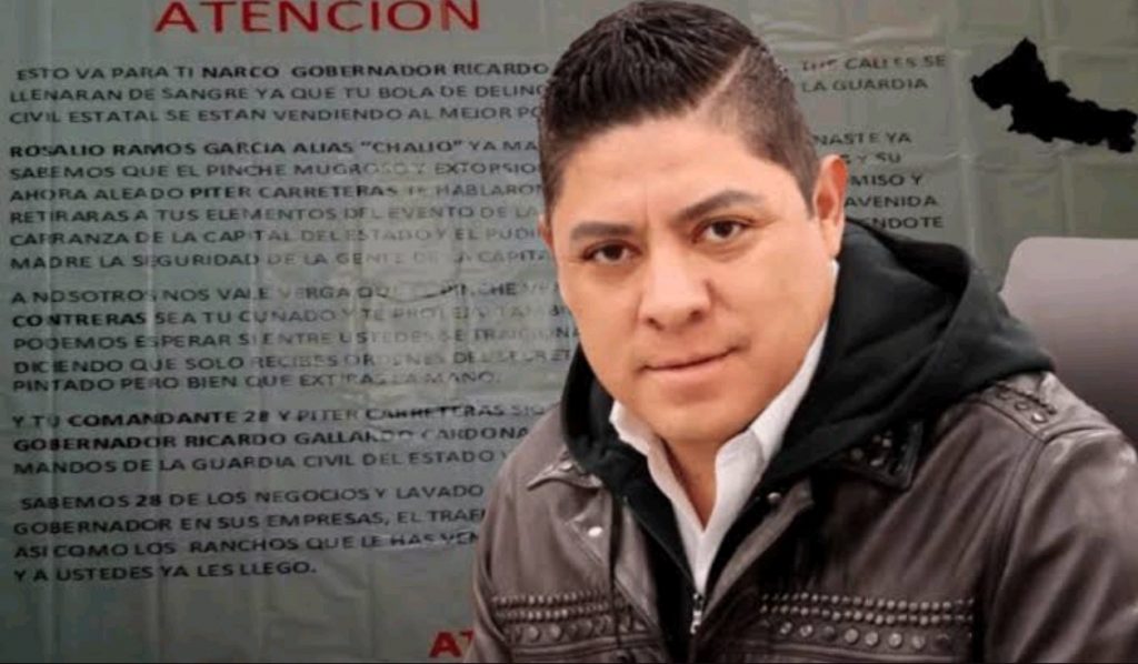 “Ricardo Gallardo Cardona, tus calles se llenarán de sangre, ya que tu bola de delincuentes que tienes en la guardia civil estatal se están vendiendo al mejor postor”, señalaron.