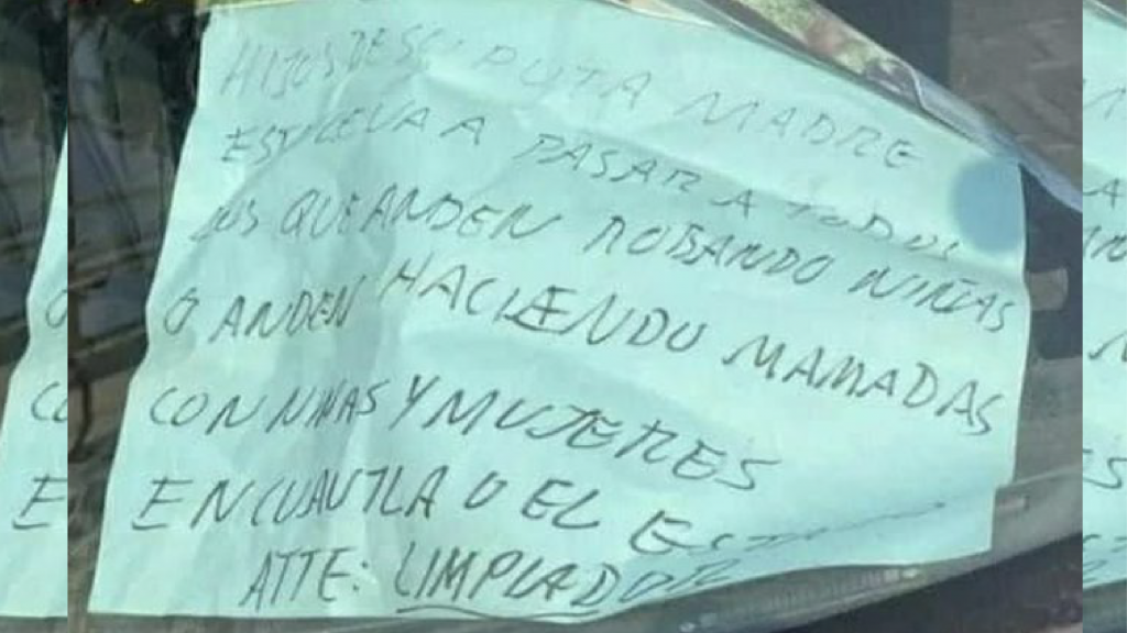 “Hijos de su pa madre. Esto le va a pasar a todos los que anden robando niñas o anden haciendo madas con niñas y mujeres. En Cuautla o en el estado. Atte: El Limpiador”, se leyó en la cartulina.
