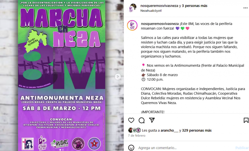 Las convocantes son: Mujeres organizadas e independientes, Justicia para Diana, Colectiva Moradas, Rudas Chimalhuacán, Cooperativa Dulce Rebeldía: mujeres en resistencia y Asamblea Vecinal Nos Queremos Vivas Neza.