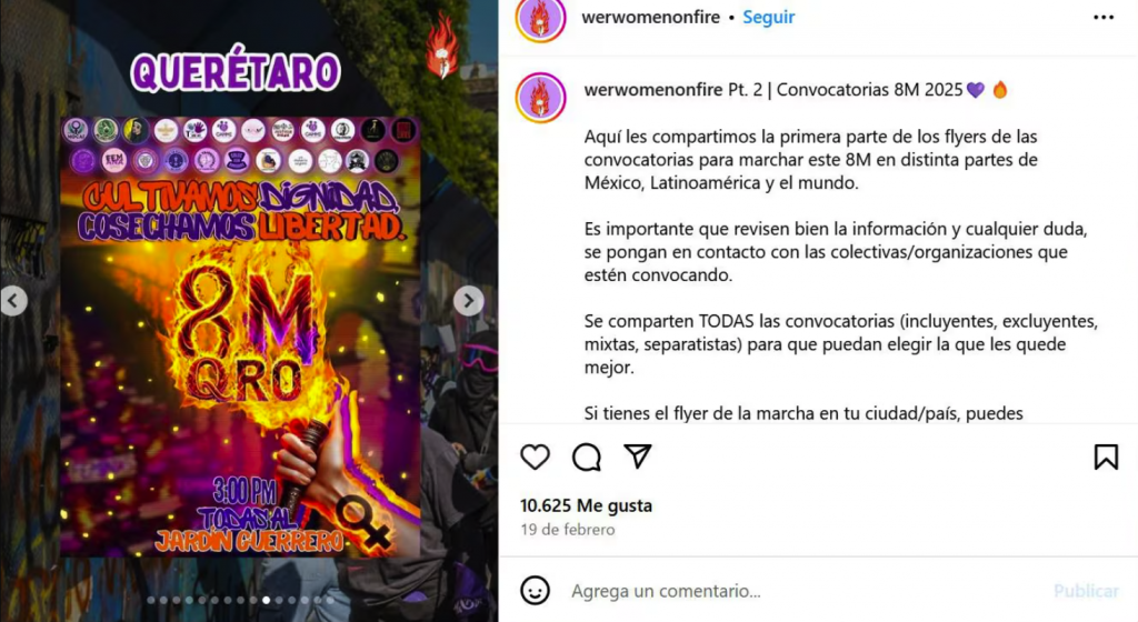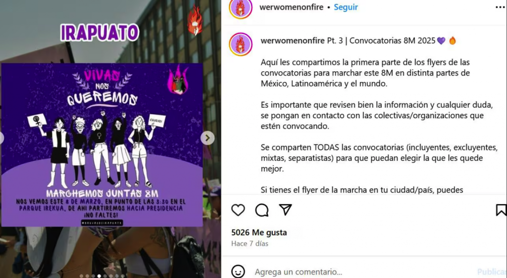 La convocatoria para marchar el 8M indica que el punto de reunión es el Parque Benito Juárez, en San Miguel de Allende. Las movilizaciones comenzarán a las 17:00 horas.