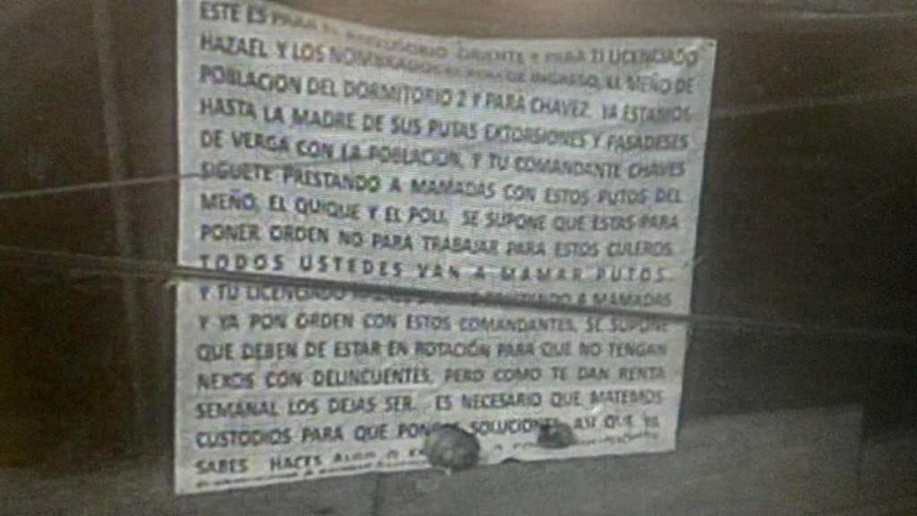 En la manta los autores se dijeron “hasta la madre de sus putas extorsiones y pasadeses de verga con la población”. Señalan al “comandante Cháves (sic) de prestarse a “mamadas con estos putos del Meño, el Quique y el Poll”, mientras que a Hazael Ruiz le exigen “poner orden con estos comandantes”. Y subrayan: “Se supone que deben de estar en rotación para que no tengan nexos con delincuentes, pero como te dan renta semanal los dejas ser”. Y amenazan con “matar a más custodios”.