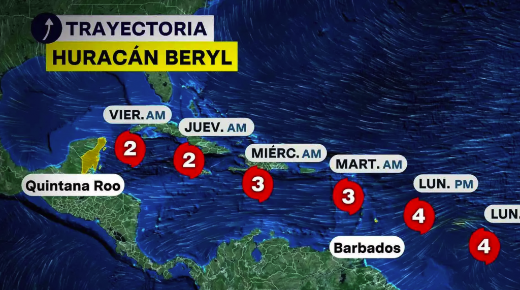 Con el paso del huracán Beryl por Jamaica se espera su primera entrada a tierra en costas mexicanas por la Península de Yucatán, afectando varios municipios y con riesgo de inundaciones por las fuertes lluvias.