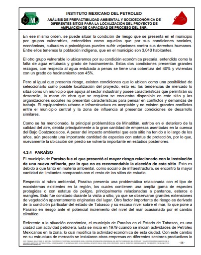 El municipio de Paraíso fue el que presentó el mayor riesgo relacionado con la instalación de una nueva refinería, por lo que no es recomendable la elección de este sitio, expusieron de manera textual desde 2008.
