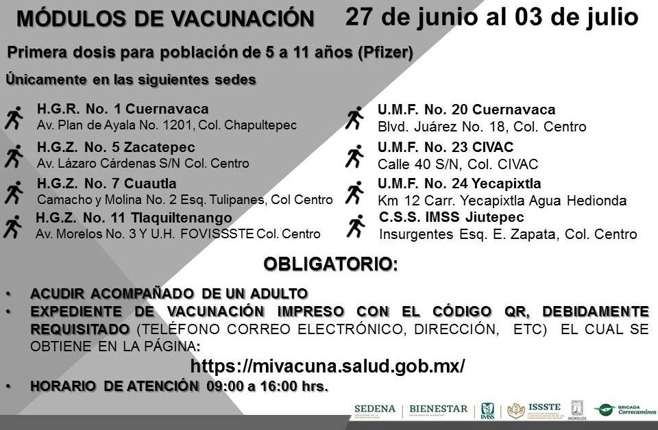 En Morelos, la vacunación contra COVID-19 a población de 5 a 11 años de edad se hará del 27 de junio al 1 de julio.