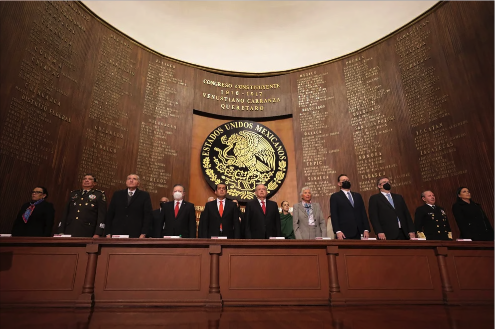 Acompañado por el presidente de la Suprema Corte de Justicia de la Nación, Arturo Zaldívar, así como del presidente de la Mesa Directiva de la Cámara de Diputados, Sergio Gutiérrez Luna; la presidenta de la Mesa Directiva del Senado, Olga Sánchez Cordero; del Secretario de Gobernación, Adán Augusto López; de las fuerzas armadas, así como de gobernadores constitucionales del país, entre otros funcionarios como el presidente del INE, Lorenzo Córdova; el Jefe del Ejecutivo destacó la importancia de las reformas que se han implementado en este sexenio, como el haber elevado a rango constitucional las pensiones a adultos mayores, las becas y el derecho a la salud.