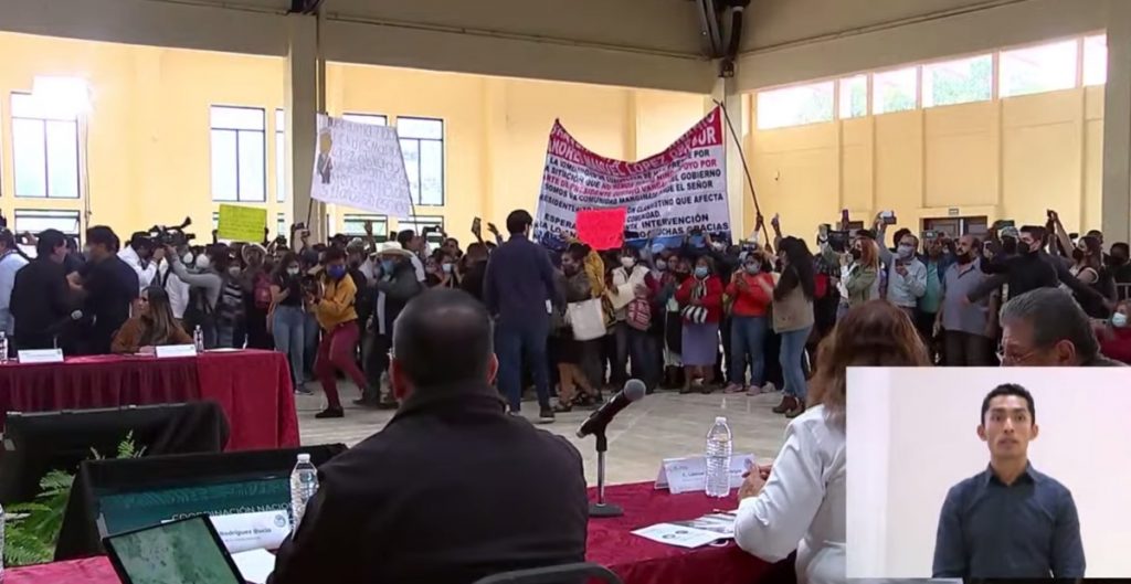 “Que se escuche bien. Todo se entregará de manera directa, sin intermediarios. ¿O quieren ustedes que los entreguemos a las organizaciones?”, dijo López Obrador mientras los protestantes aguardaban a un costado de la mesa desde donde el presidente hablaba.