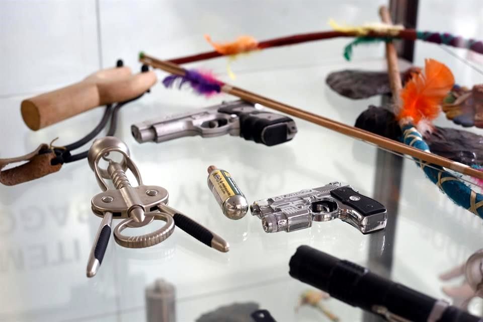 En una vitrina, la terminal área se exhiben artículos que no están permitidos subir a la cabina del avión.