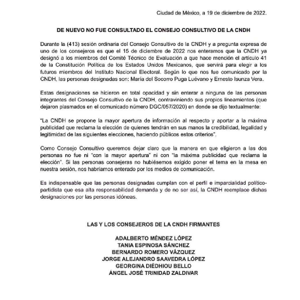 Los firmantes fueron los seis integrantes que presiden el Consejo Consultivo de la CNDH, quienes expresaron la necesidad de que las personas designadas cumplan con el perfil requerido de imparcialidad político-partidista.