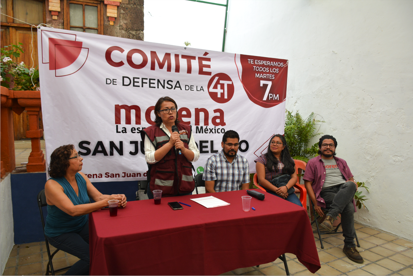 La toma de protesta del comité de base en defensa de la 4T del partido Morena, se efectuó la tarde del sábado 25 de marzo en pleno centro de la ciudad de San Juan del Río, en presencia de Rosalba Vázquez presidenta del Consejo Estatal, quien acudió a la ceremonia en representación de Rufina Benítez, dirigente estatal de Morena en Querétaro, se llevo a cabo la votación y conformación del comité base en san Juan del Río.