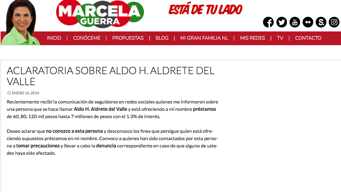 Un hecho llamativo es que, en 2014, la ahora diputada federal priista Marcela Guerra publicó un aviso alertando “sobre una persona que se hace llamar Aldo H. Aldrete y está ofreciendo a mi nombre préstamos de 60, 80, 120 mil pesos hasta 7 millones de pesos con el 1.3% de interés”,