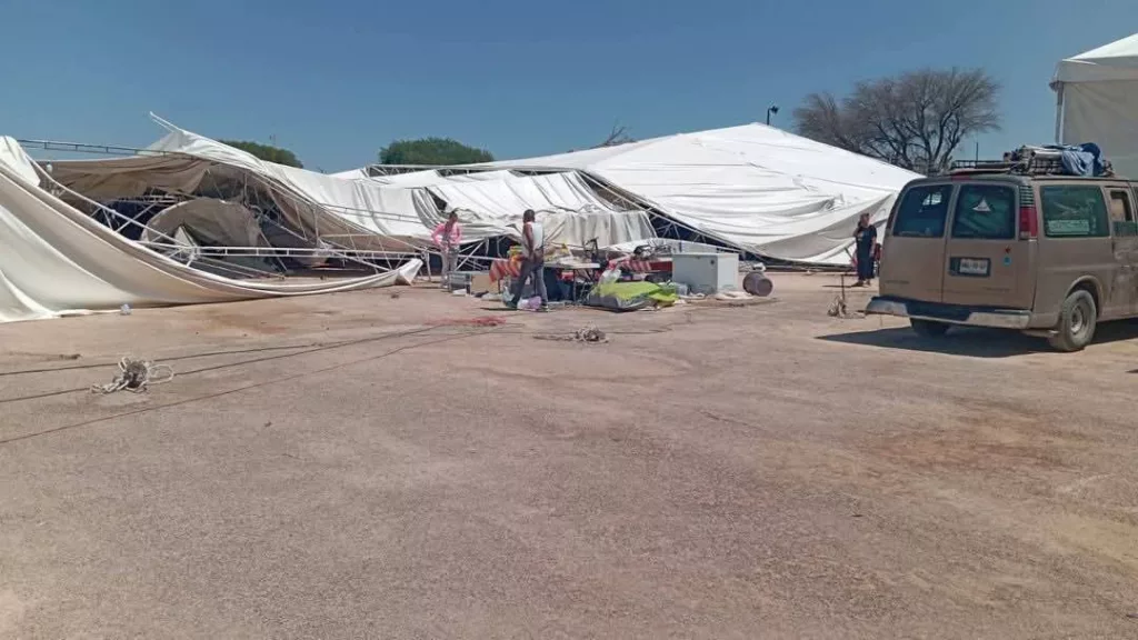 Personal de la Feria indicó que este 28 de abril, debido a los fuertes vientos y un remolino que se presentó en la zona, se registró el desplome de una carpa instalada en el recinto ferial.